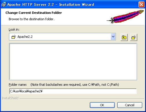 Linux(fedora)となるべく同様なパスで行ける様にしたいため, C:\usr\local\apache2\ としてインストールを考えてみる。